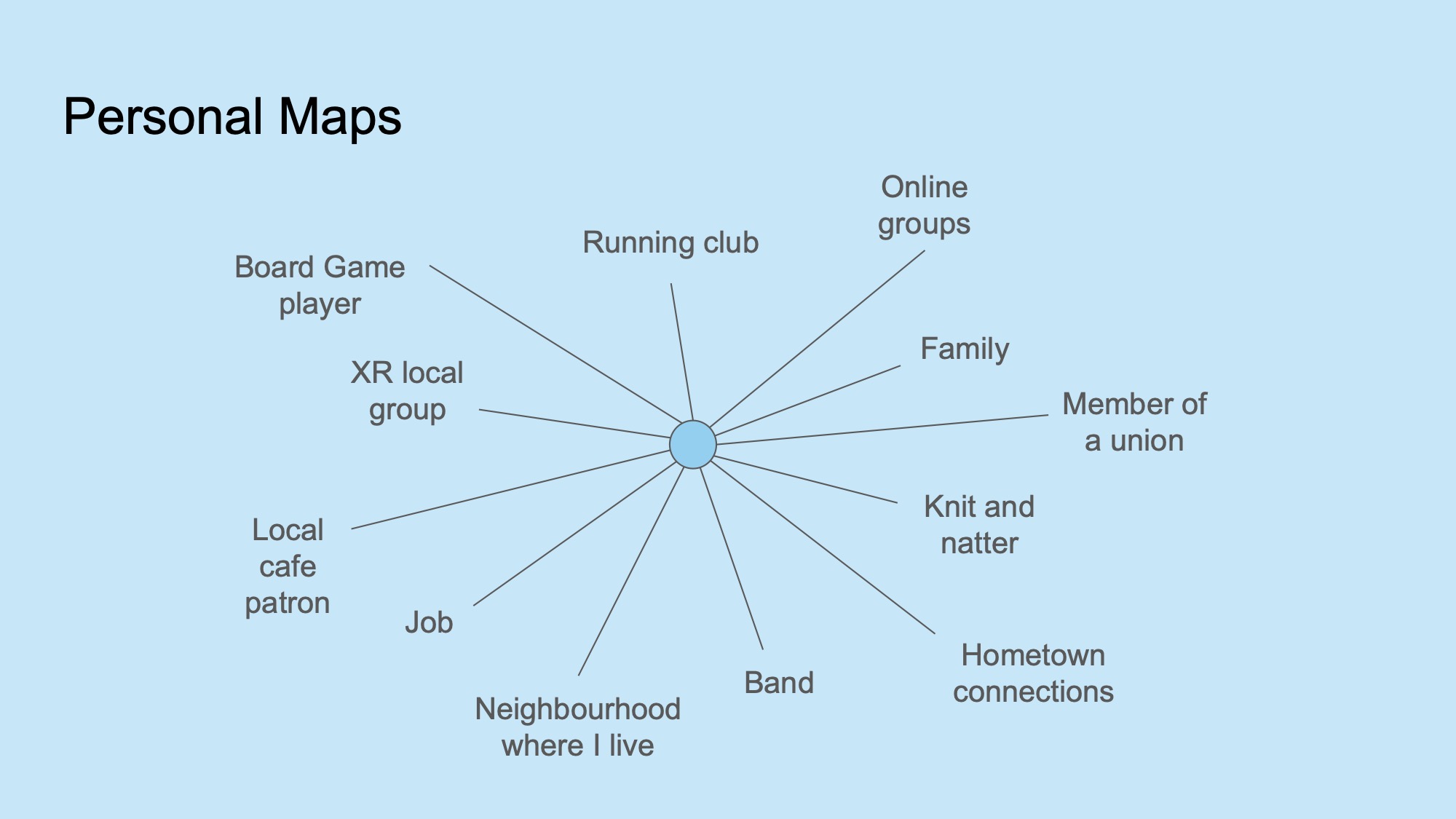 - Personal Maps - to understand how we interact with our communities.