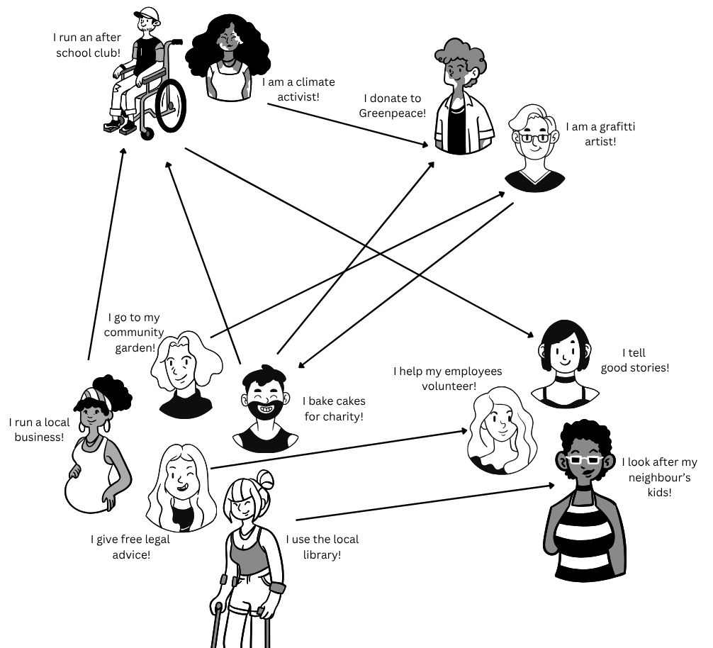 The assets of your neighbourhood are anything that exists there which enriches the experience of being in that space. They could be as simple as having wildflowers planted on the verge for pollinators or as complex as regular Community Assemblies where the neighbourhood discusses how to spend money.