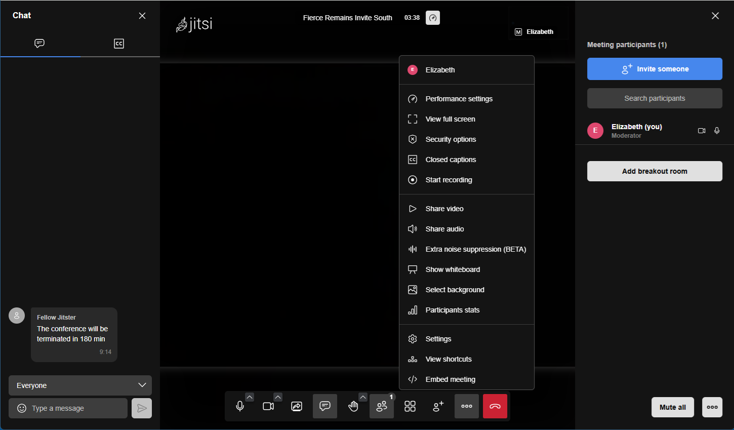 Once in the meeting, the screen should look similar to the image below. Here the Chat window has been opened, showing the standard message that there is a 180 minute limit on all meetings (this is configurable, should it be necessary). The Chat window is also where Closed Captions (subtitles) can be turned on.