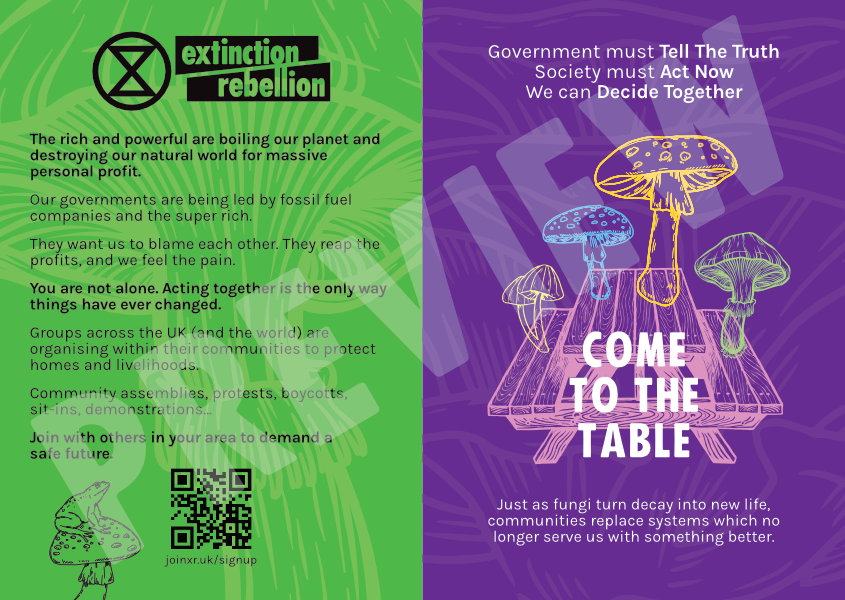 Flyers are a great way to prompt a conversation, and to leave someone with a way to follow up afterwards. Here are ready to print flyers for themes, actions and general climate and ecological messaging. If you have designs you've made, suggestions, or requests, please feel free to email us on XR UK Outreach.